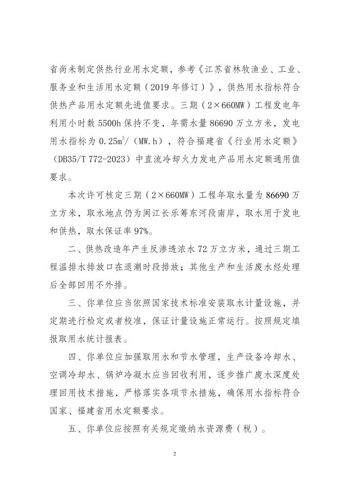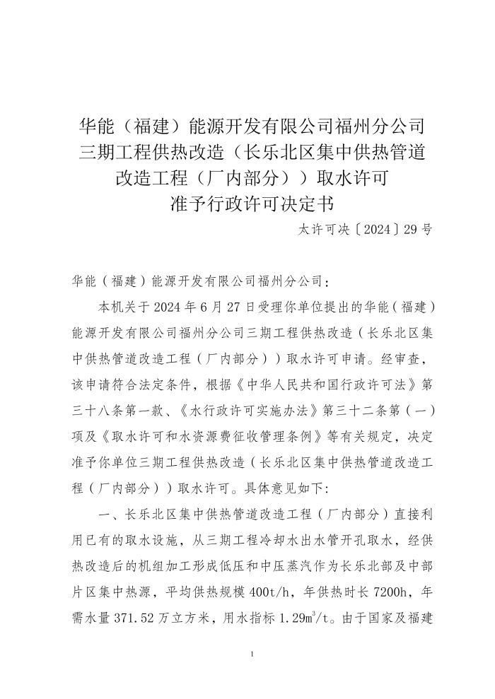 华能(福建)能源开发有限公司福州分公司三期工程供热改造(长乐北区集中供热管道改造工程(厂内部分))取水许可准予行政许可决定书.pdf